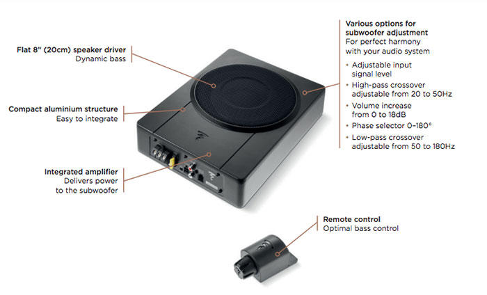 Measuring 21/2” (6.3cm) high, it slides easily underneath a seat, even a tight-fitting one. Thanks to the available settings, you can customise the sound reproduction. A wired remote control is also included for users to adjust the bass level as desired.