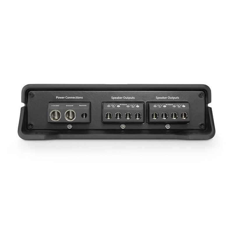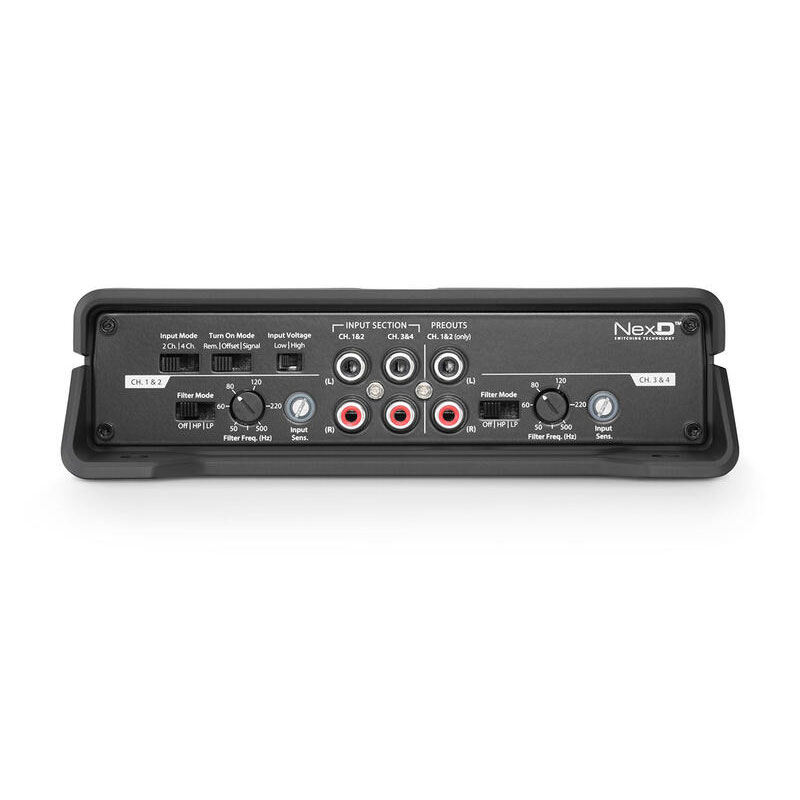 Utilizing our exclusive NexDâ„¢ high-speed switching technologies, the JD400/4 amplifier is engineered to deliver loads of clean power, with excellent efficiency and low distortion. This little guy churns out 100 watts of audio from each of its four channels into 2 ohms (14.4V, 1% THD) and is fully bridgeable, so it can be used as a 3-channel amplifier, or as a 2-channel amplifier producing a whopping 200W x 2 into 4 ohms.