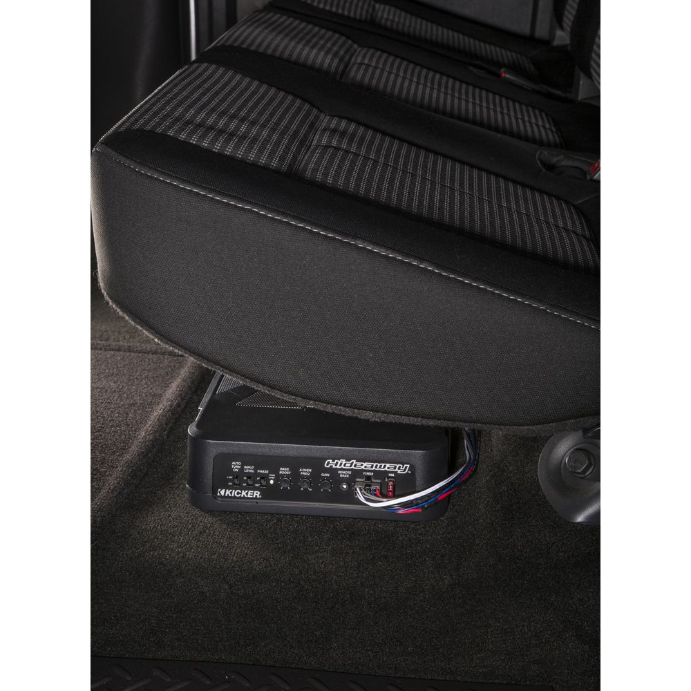 The quick-connect Molex® plug and harness entails power, signal and remote turn-on. The Hideaway comes with a remote bass control for fine-tuning bass levels, adjustable low-pass crossover, variable +6dB bass boost, phase-cancelling switch for max output and two automatic turn-on options. It also features high- and low-level inputs for integration with nearly any factory or aftermarket head unit