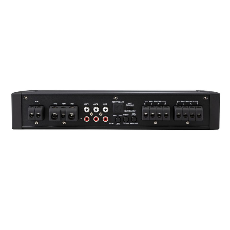 This KXMA amplifier delivers as much as 125 watts into four full-range channels, or 250 watts into two sets of bridged channels. A separate subwoofer channel delivers as much as 400 watts.