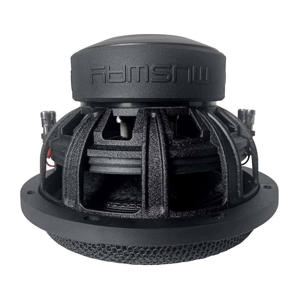 Not only is the first look convincing, the technology in detail is also impressive: all woofers are characterized by a particularly long and even membrane stroke. With the MG12 it is up to +/- 22 mm, i.e. a total stroke of an impressive 44 mm is possible! This enormous deflection is controlled by specially shaped dual spiders made of polycotton, the properties of which have been continuously optimized by the MUSWAY sound engineers in laboratory and sound tests. The moving mass (Mms) could also be kept low by using copper-clad aluminum voice coils (CCAW). All of the measures result in very favorable Thiele/Small parameters, so that the subwoofers are also very suitable for closed housings. What stands out here is the MG10, which, with a speaker volume of 25 liters, plays deep and cleanly into the bass cellar up to 43 Hz (-3 dB). Anyone who attaches great importance to high impulse fidelity and cleanliness should choose this version.