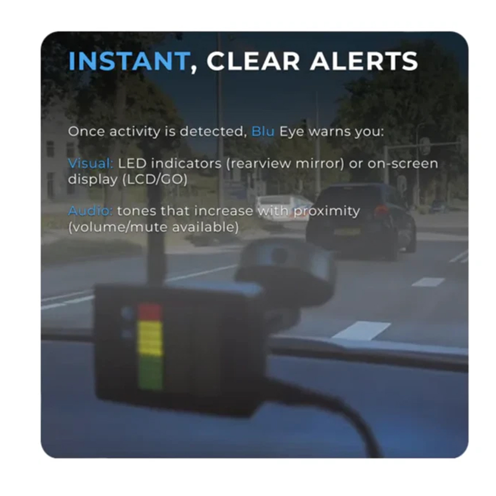 Blu Eye GO detects the presence of nearby emergency service vehicles including marked and unmarked police cars, ambulances and fire engines,often before they are visible. Those extra seconds help you to: