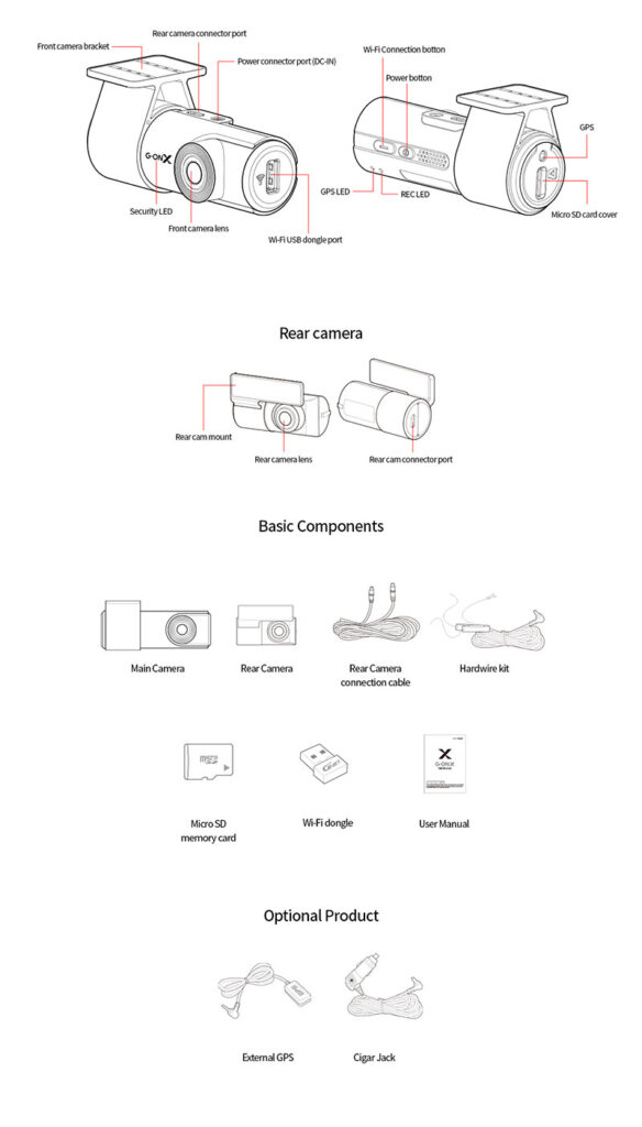 Connectivity: GNET Wi-Fi App GPS: External GPS The G-ONX is not just a dash camera; it’s a part of your connected driving experience. With the GNET Wi-Fi App, you can easily access your recordings and control your dash camera from your smartphone. Need to check a specific moment or share an exciting event? It’s as simple as a few taps on your phone. Additionally, the external GPS feature provides accurate location data, enhancing your overall driving experience.