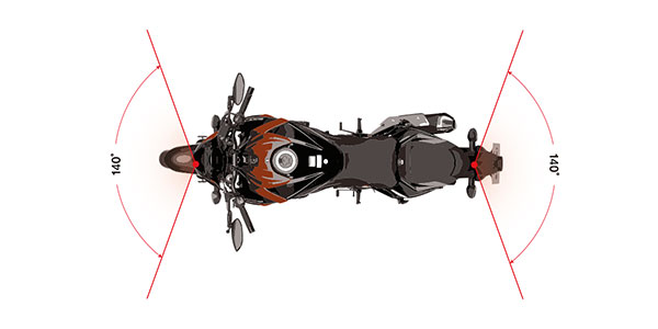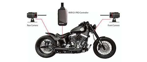 The camera system is designed to be mounted integrally with the motorcycle’s body for stable recording. The system includes front and rear cameras, which can be placed in the following locations: